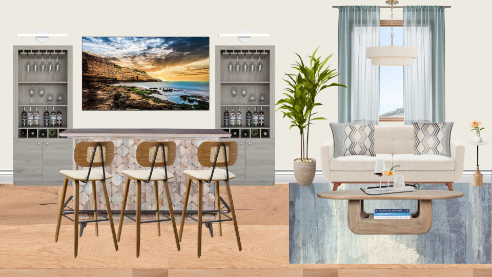 Create a bar space that feels breezy, refined, and effortlessly inviting — where soft sandy neutrals, crisp whites, woven textures, and subtle ocean-inspired hues come together to capture the relaxed elegance of seaside living. This Coastal Bar Design Board is curated to transform your entertaining area into a light-filled retreat perfect for hosting with ease.