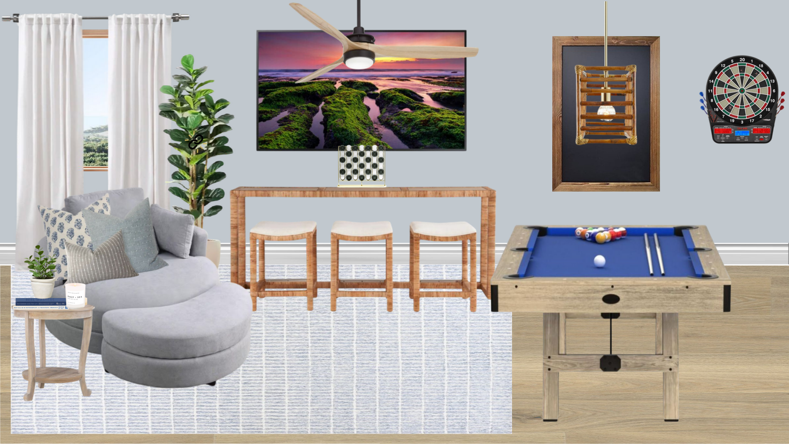 ✨ Elegant design concept featuring a breezy coastal aesthetic for a fun and inviting game room