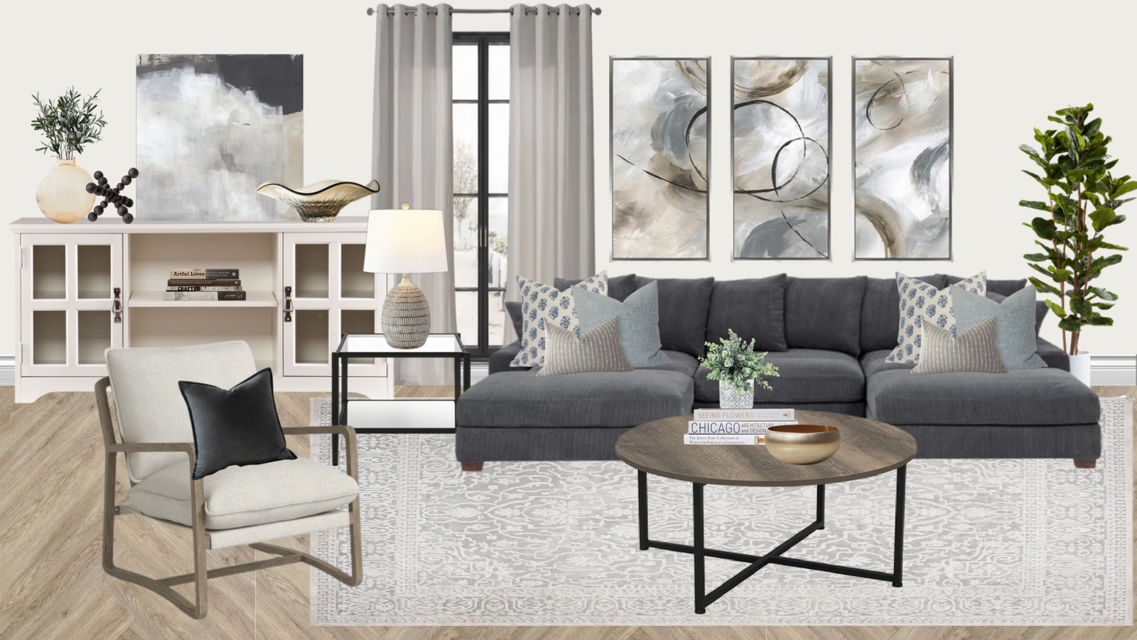 Design the perfect non-luxury transitional living room that blends comfort and classic design for a space that’s both stylish and practical. 🛋️✨